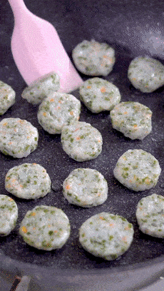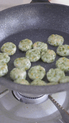 烙這種蝦丸,火候還是要註意一下,全程小火,等丸子兩面都是金黃的,完全熟透瞭就盡快盛出來。
