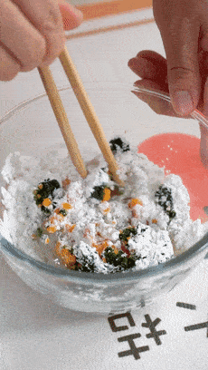 主要食材處理完畢之後,接著再來加配料。胡蘿卜碎、裙帶菜碎、蛋清、鹽和淀粉全都加進去,不僅鮮味有瞭,丸子的口感也能更加Q彈。