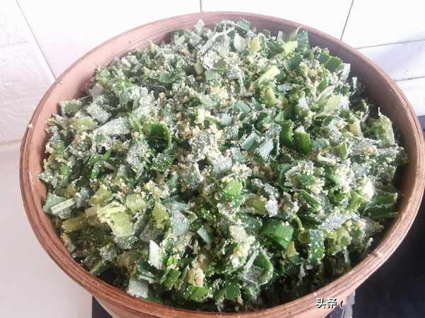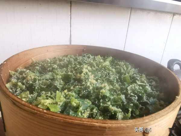 第六步:充分的拌勻,放到篦子上,大火燒開,改成中火蒸大約10分鐘,不要蒸制的時間太久吧,時間太久瞭蒜葉就會變色。