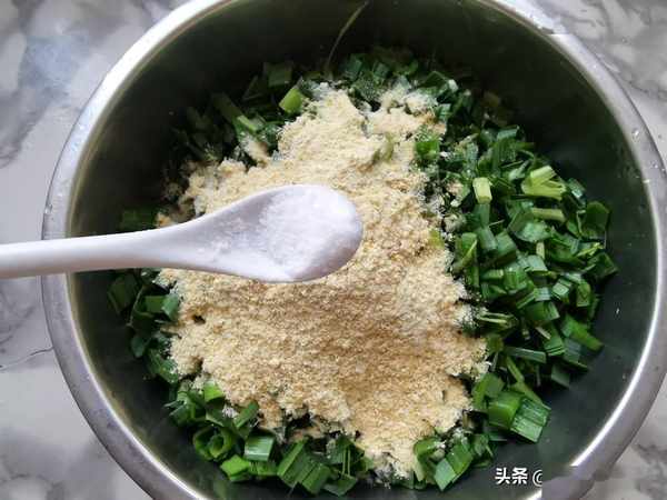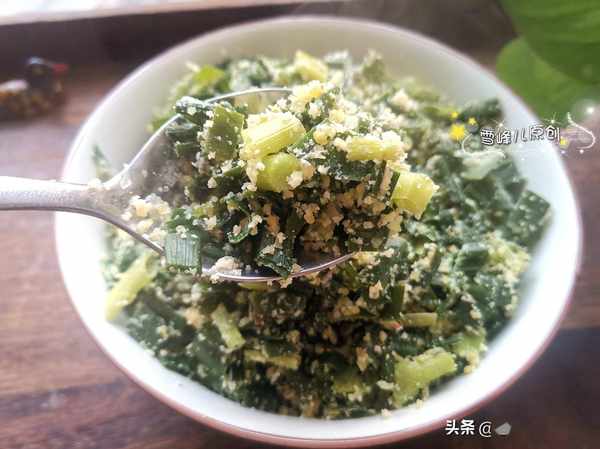 第五步:切碎的蒜葉放入盆中,加入黃豆粉,再加入適量的調味,鹽的用量和我們平時炒菜差不多,不放鹽是不好吃的哈。