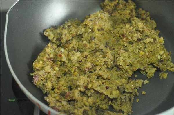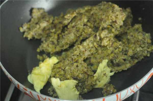 將攪拌好的綠豆泥倒入不粘鍋中,放入50克黃油,喜歡甜的再放入一點冰糖,口味淡的也可不放,紅棗就已經有甜味兒瞭。