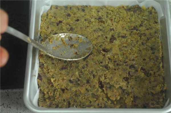為瞭方便吃,給它定型一下。將炒好的綠豆糕放入鋪瞭油紙的模具裡,用勺子壓緊。