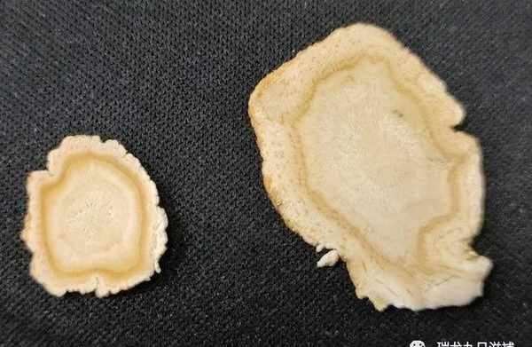 另外,好的西洋參,橫切面有一圈清晰的內圈,外圈有很多棕色麻點,這是西洋參的營養管。可以看到,進口西洋參片的麻點很多,而國產西洋參的麻點較少。