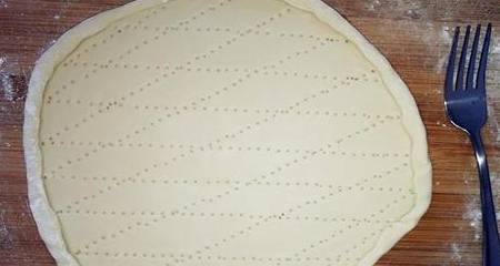 2、發酵好的面團先搟成面餅,最邊上薄一點然後卷回去,卷一圈半。然後用刀叉整齊或者胡亂的紮一些小孔。然後加熱電餅鐺,倒一點油刷均勻,放上面餅。
