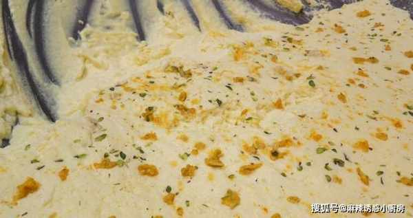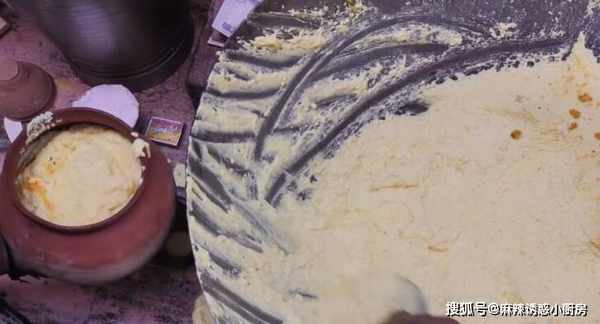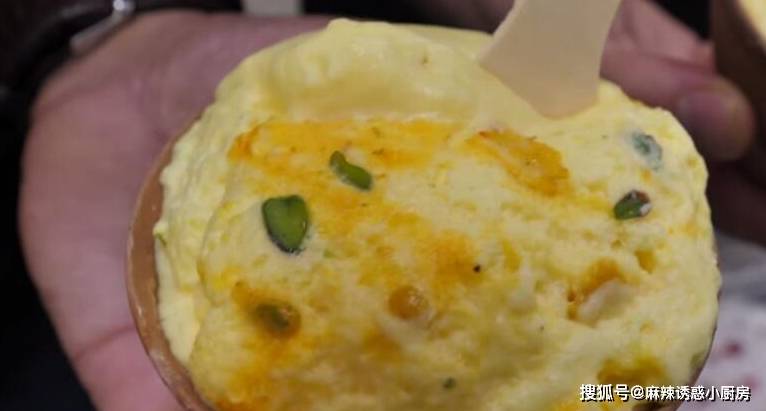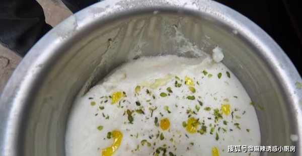 男子的小攤上有一個很大的大鐵鍋,男子做瞭一大鍋的奶泡,在大鍋上面放入瞭一些菠蘿粒,奶泡的做法你一定不知道,首先把牛奶倒進容器裡,加入白糖然後打發。