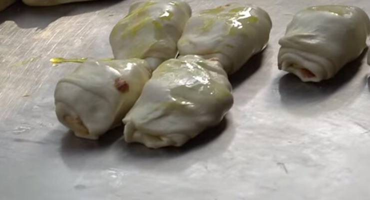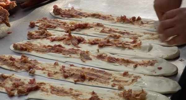 大叔往上面放瞭肉末後,然後再把搟開的面團裹起來,大叔做的小吃之所以有這麼多人來購買,全是因為大叔做這道小吃全是當著顧客的面現做的,整個流程都是大傢看得見的,肉末的量也很足。