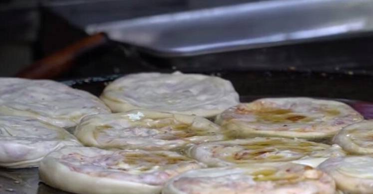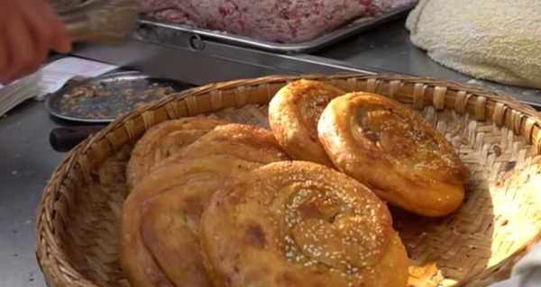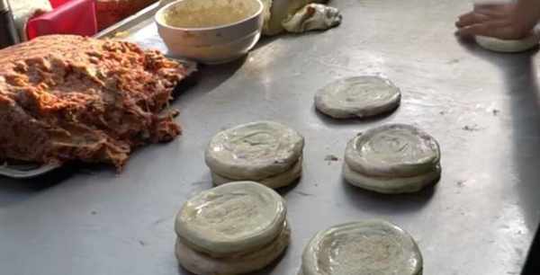 大叔把放瞭肉末的面團裹起來後,又用搟面杖把面團搟成長條,再次放入肉末卷起來,最後再搟成圓圓的餅,一般做餅都隻放一次陷,可大叔放瞭兩次陷,所以味道會更加的好。