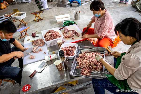 室外大棚下,三位工作人員正在切肉、串串兒。