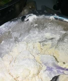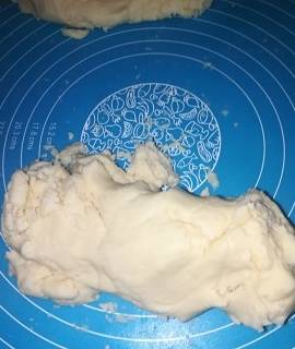 6.面團混合到沒有幹粉即可,不需要光滑。然後放置面板上用手輕輕壓成團。切記不能揉。