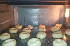 8.用食指在整好的面團上輕輕壓一個洞,面團不能出現裂紋,也不能用手壓成面餅,在烘烤的過程中,面團自然會變大變薄,所以,放置時應該有一定的間隔。面團中間可以放幾顆芝麻。