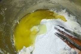 2.加入料理機磨成粉的白糖(磨成粉更易融合),花生油和玉米油,用筷子手動向一個方向攪動,直至完全融化,如酸奶狀,整個過程大概四分鐘。