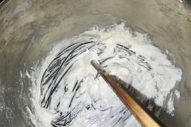 1.80g豬油用筷子攪拌打圈,直至圖中發泡軟化狀態。(冬天天冷,豬油呈比較硬的固態,打發變軟後可以與糖粉更好的融合。夏天此步驟可以省略)