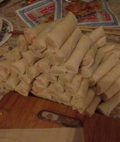我們這兒每年春節都會炸春卷吃,大年三十全傢聚在一起時會有;親戚到訪時,也會預備這道小食。
