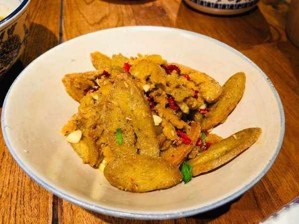 石磨豆腐,作為豆腐的超級愛好者,這種店傢自己做的,帶著濃鬱豆花香氣的豆腐,真的推薦點,豆腐大塊,隨意下鍋燜,口感滑嫩又有點老豆腐的香氣,連邊角料豆渣都做成瞭豆豉香味的下飯的菜。