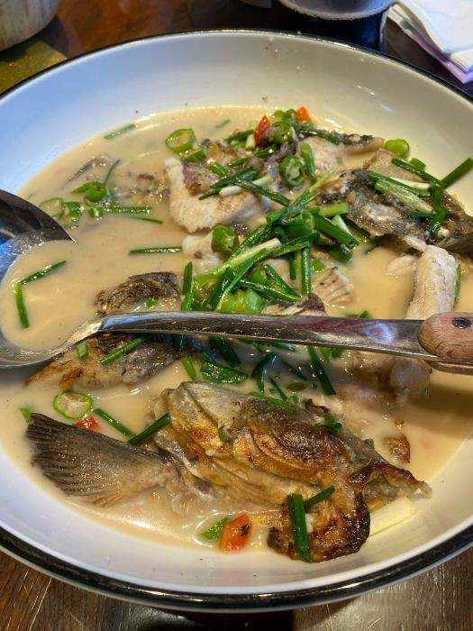 黃燜魚,口味鮮甜,魚整條被茶油煎制外表金黃,再原湯燜煮,所以魚肉鮮甜細嫩,湯色奶白,這道菜很適合老人和孩子。