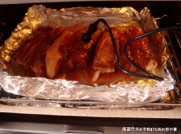2、第二天打開保鮮膜,給梅花肉翻個面,再包上保鮮膜,放進冰箱裡冷藏8個小時,讓梅花肉充分入味。準備好烤箱,220℃預熱10分鐘,烤盤鋪上錫紙,放上醃好的梅花肉,剩餘的料汁也倒進來,把錫紙包好。