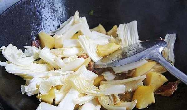 5、加入白菜條和土豆塊翻炒;