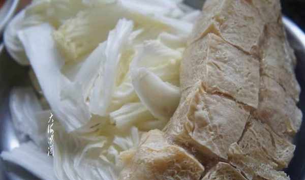 2、白菜心切順條;凍豆腐冷水解凍;