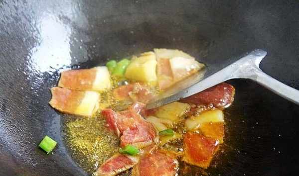 4、炒鍋加入適量的油,爆香蔥薑碎和五香粉,加入醃制好的豬肉翻炒;