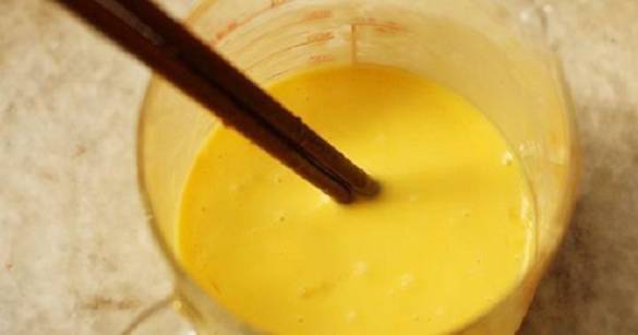 5.將雞蛋打入碗中,倒入適量的椰漿,攪拌均勻。