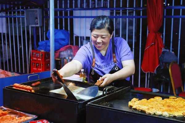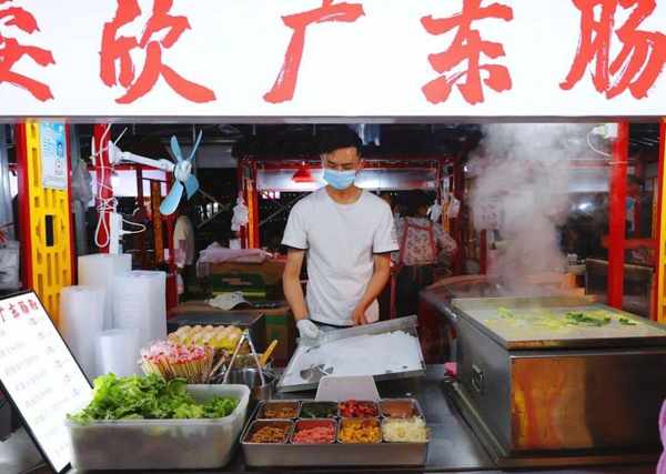 缽缽雞對面,糯嘰嘰的車輪餅攤前也聚集著不少孩子,攤主是個26歲的年輕人。“大傢吃完麻辣鮮香,都愛這一口甜的。”聊起生意經,這位“95後”得意道,“天氣越來越熱,下個月我還計劃推出新品,用冰涼涼的甜品,給顧客們新的夏天快樂。”