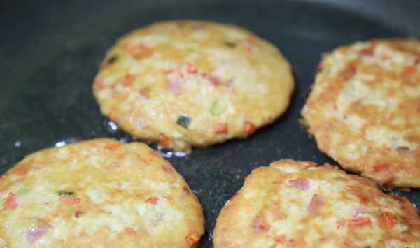 第五步,鍋中刷上一層底油,加熱至4成熱左右,然後用手將豆腐餡大致壓成圓形的餅狀,直接放在平底鍋中就可以瞭。