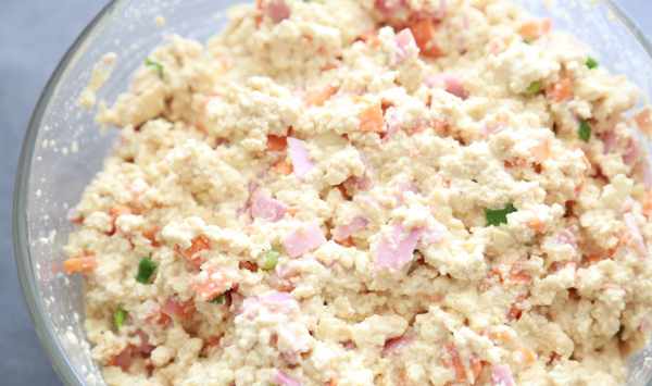 第三步,將切好的材料和豆腐全部放在碗中混合,這裡最好用稍微大一點的碗,不然在攪拌的時候操作不太方便。