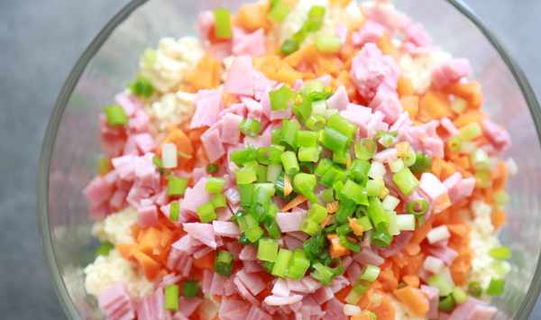 第二步,胡蘿卜去皮,用一半的量就可以,切成稍微碎一點的胡蘿卜丁;香蔥切成蔥花;火腿同樣切成小丁,沒有火腿的話也可以換成香腸。