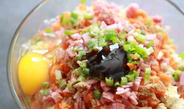 豆腐1塊,胡蘿卜半根,火腿50g,香蔥1根,雞蛋1個,生抽2勺,蠔油1勺,鹽適量,淀粉2勺。