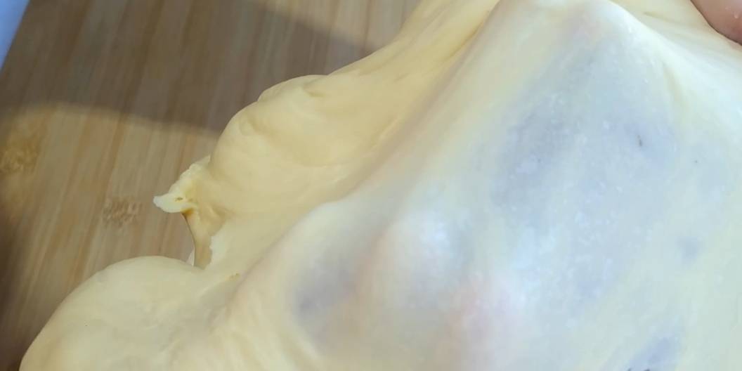 分次加入300g面粉,邊倒邊攪拌,攪拌成絮狀,下手揉成一個光滑的面團,面板倒上20ml食用油,把揉光滑的面團放到面板上,像洗衣服一樣揉搓面團,(這個步驟很關鍵》我們要耐心的揉面,我開始揉搓出手套膜需要20多分鐘才能揉出來,經常練習後,揉膜的時間就越來越短瞭,這次用瞭13分鐘就揉出手套膜啦
