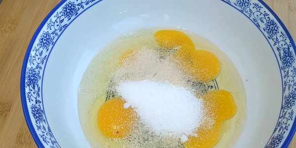 首先盆裡打入4顆雞蛋,加入4g酵母粉,倒入25g白砂糖,用筷子攪均勻。