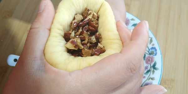 把揉好的面團,搟成薄餅狀,包入紅棗碎,用虎口轉動封口再揉圓。