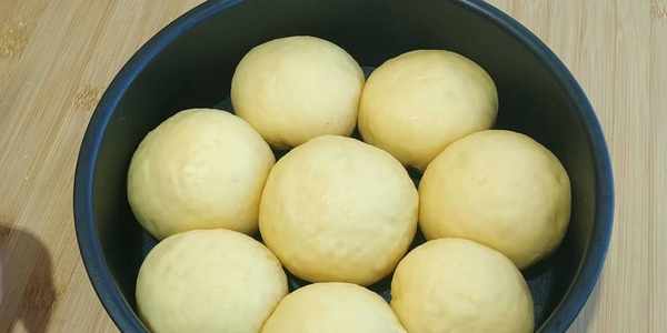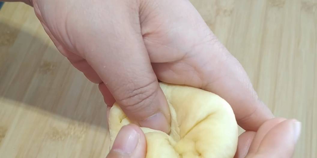 切大小均勻的劑子,取一個劑子用手向裡按壓再揉圓,這樣做出來的面包層次會更豐富。