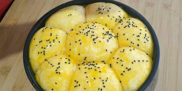 二次醒發好以後已經變得胖乎乎的瞭,用刷子刷上蛋黃液,撒上黑芝麻點綴一下,好看又好吃,不喜歡吃芝麻也可以不撒。