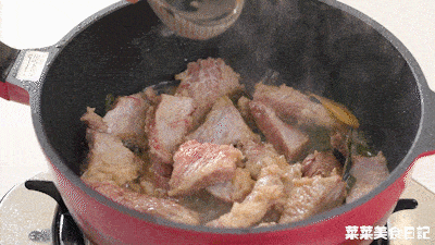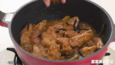8.加入生抽、蚝油、紅燒醬油、冰片糖碎、鹽翻炒均勻,加入八角,注入剛好沒過食材量的開水。
