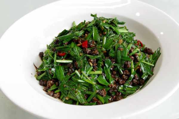 韭菜炒田螺,田螺用的是螺頭肉,以前類似做法常吃湖南的酸豆角,辣椒炒,感覺湖北的這種做法很小清新呢,搭配當季韭菜,清爽好吃。