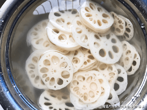 1、蓮藕去皮切片,洗幹凈後瀝幹水分。燒一鍋開水,加入一勺鹽、一勺醋,倒入藕片煮1分鐘,撈出過涼水,瀝幹水分備用。