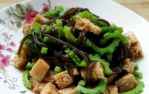 做法:苦瓜切成薄片,放入熱水中浸泡;在將蕨根粉也放入浸泡;面筋切小塊備用;將浸泡好的苦瓜片和蕨根粉撈出盛如盆中,再將面筋加入;加香油、鹽、、白醋、醬油,拌勻即可;