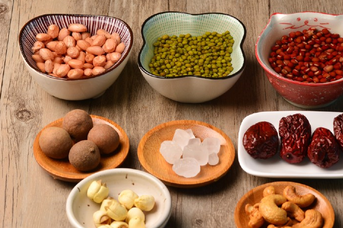 食材:水發花生50克,水發綠豆45克,水發紅豆50克,無核紅棗12克,冰糖8克,桂圓4顆,水發蓮子10克,腰果5克。