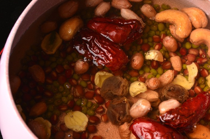 第一步:將花生、綠豆、紅豆、蓮子、無核紅棗、腰果淘洗幹凈,放入鍋中。桂圓剝掉外殼,去籽放入鍋中,倒入800毫升的純凈水,開大火煮15分鐘後,加入冰糖,轉小火煮5分鐘,即可出鍋。