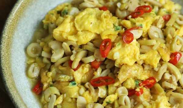 做酸筍炒雞蛋,要比用其他配菜炒蛋復雜一些,我一般都是先用大蔥炒蛋,炒好盛出來,重新起鍋炒酸筍,然後放入炒好的雞蛋混合翻炒。因為酸筍要比雞蛋耐炒,先將雞蛋炒好盛出,能更好的保持住雞蛋鮮嫩的口感,要是炒老瞭就不好吃瞭;單獨炒酸筍,酸筍經過長時間的煸炒,更能激發出它的香氣,這樣吃起來口感更脆,這也算是做這道菜的一個小竅門吧。