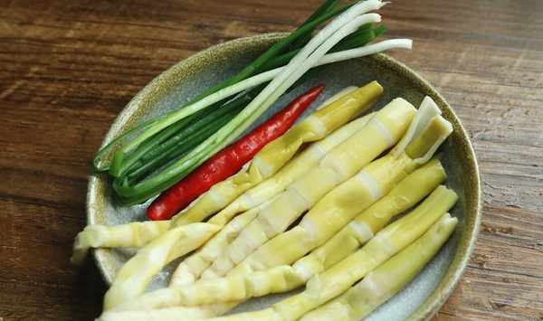 第一步,準備好所需的食材,酸筍、雞蛋、紅辣椒、大蔥、鹽。