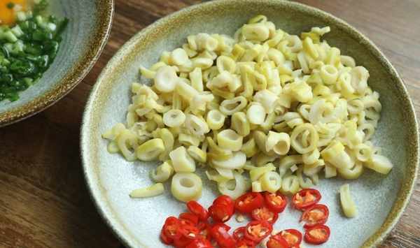 第二步,酸筍和紅辣椒用清水沖洗一遍,改刀切成圈,雞蛋先打入碗中,蔥切成蔥花備用。