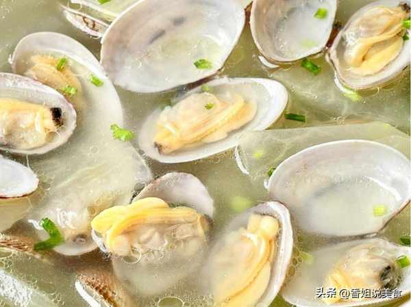 4、冬瓜煮熟之後,放入花甲、食鹽繼續煮2分鐘。煮好之後,撒上蔥花就可以出鍋開吃瞭。