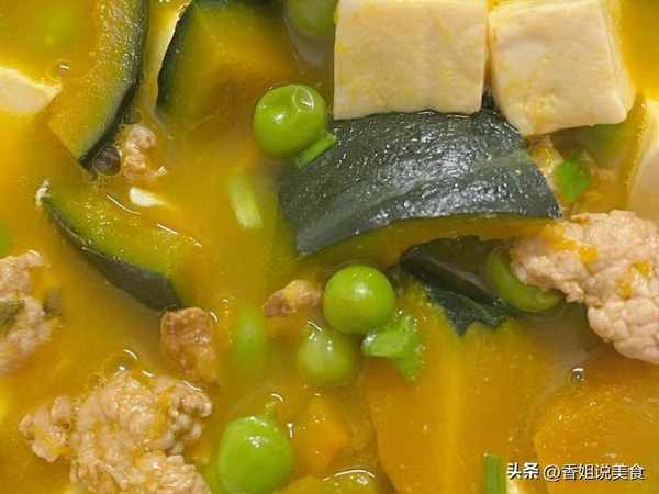 3、接著放入貝貝南瓜、豌豆,繼續煮十分鐘左右。然後放入嫩豆腐、食鹽,繼續煮5分鐘左右。所有食材煮熟後,撒上蔥花即可出鍋開吃。