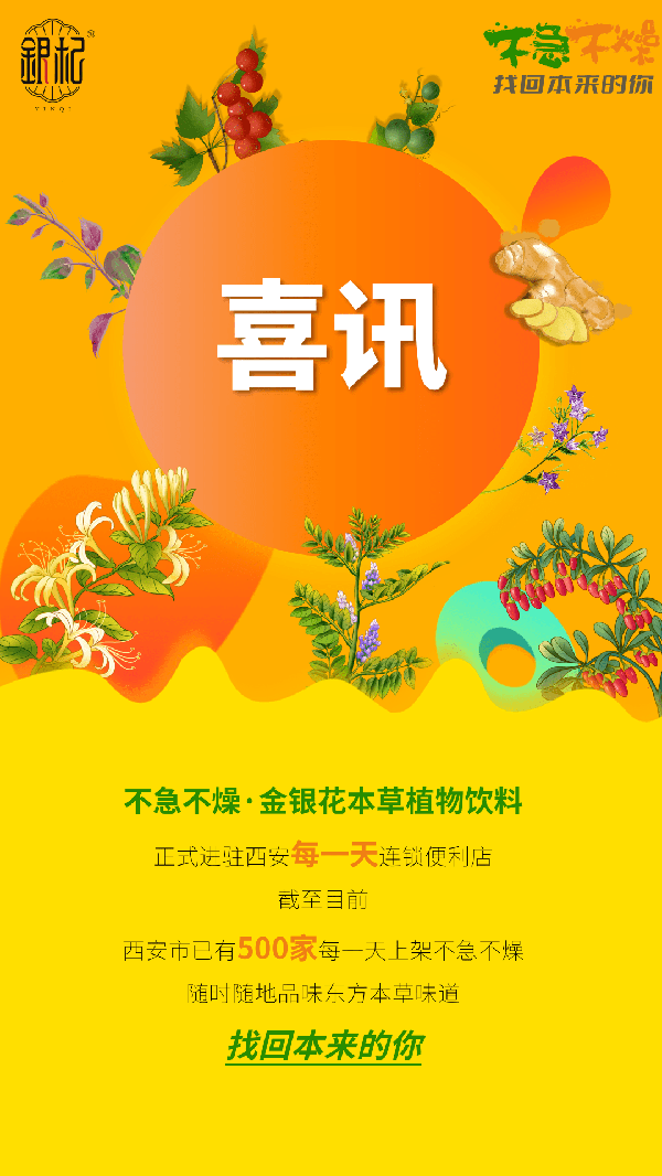 焦慮擠壓的時代,“不急不燥”將藥食同源的中醫藥文化精髓,與金銀花等本草植物完美結合,研發出適合東方人體質的國潮飲品。為充分發揮本草植物自然天成的價值作用,“不急不燥”選用適合各種本草植物的萃取方式, 最大程度保留瞭各種本草的營養成分和藥用價值。其在西安“每一天”上架,標志著“不急不燥·金銀花本草植物飲料”正式開啟西北市場。