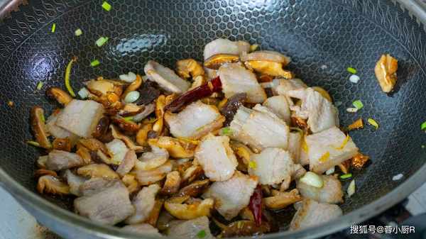 2、五花肉炒至有點微焦後倒入蔥薑蒜,再把香菇倒進來一起炒,先把香菇裡面的水分炒幹。