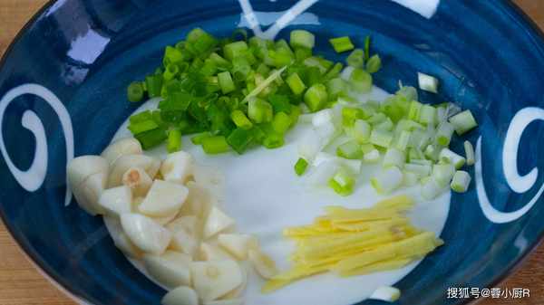6、最後再切點蔥薑蒜,小蔥切蔥花,生薑切絲,大蒜切片。