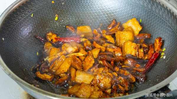 1、起鍋熱油,倒入五花肉,先煸炒出油脂,這樣五花肉吃來的口感才不會膩,接著倒入2個八角,2個幹辣椒增香提味。