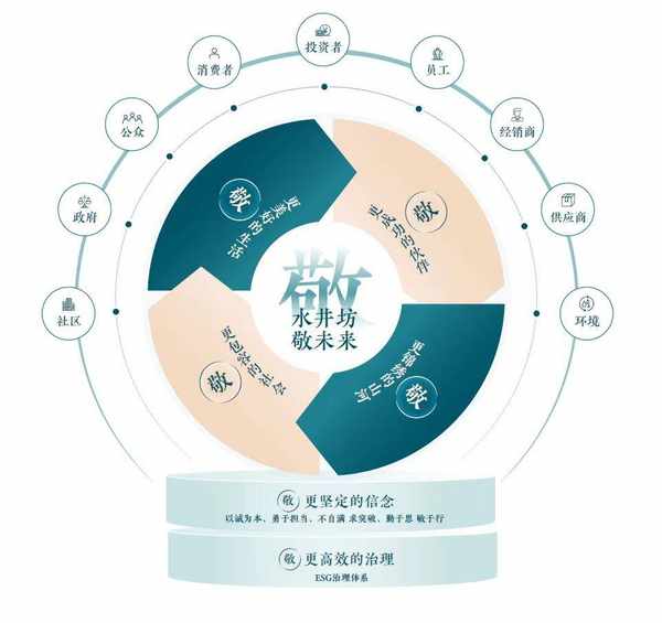 報告中首次發佈的“水井坊2035可持續發展目標“,以“水井坊·敬未來”作為ESG戰略核心,圍繞商業道德與合規、產品質量與安全、理性飲酒、職業健康與安全、供應鏈管理、原料采購可持續性、社區發展、水資源管理、包裝與廢棄物管理、能源與碳排放管理等十大關鍵領域設置瞭26個細分目標,響應多元利益相關方的期待,為公司中長期可持續發展設定瞭系統性的可衡量指標。中國循環經濟協會常務副會長趙凱對報告中披露的ESG目標給予瞭高度評價,他表示水井坊以“水井坊·敬未來”作為ESG戰略核心,全面部署實施ESG戰略。從ESG報告設置的10個領域26個ESG關鍵指標看,水井坊以公司價值觀為精神驅動,積極完善高效的ESG治理體系,領跑白酒企業ESG工作,踐行綠色發展理念,為促進人與自然和諧共生貢獻一份力量。